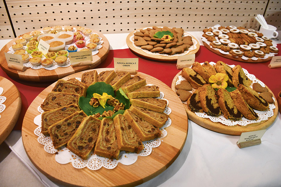 Ob koncu uvodnega dela je predsednica društva Elizabeta Verščaj obiskovalcem predstavila razstavljene jedi in jih povabila k pokušini. Ponujenih je bilo okrog 50 najrazličnejših jedi iz ajde – tako slanih kot sladkih: ajdov potancelj, ajdova pogača s skutnim nadevom, različne vrste kruha, različne kombinacije ajdovih solat in namazov, pa tudi sladice, kot so ajdova pita s kakijem, palačinke, rulade, ajdova pita s sadnim jogurtom, ajdov šarkelj z rozinami, narastek iz ajdove kaše, ajdovi mafini in piškoti, potica ter celo ajdova torta.