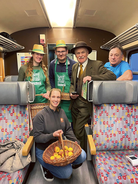 Z otroki se srečamo v šolah in vrtcih, širšo javnost pa težje dosežemo. A rešitev je letos prišla na pladnju, ko smo dobili povabilo Čebelarske zveze Slovenije (ČZS) in Kmetijsko-gozdarske zbornice (KGZS), da se pridružimo akciji Lokalna hrana na vlakih. Aktivirali smo naše pridne prostovoljce, ki so skupaj s svetovalci kmetijsko svetovalne službe in čebelarji potnikom na vlakih po vsej Sloveniji delili jabolka in med. Odziv potnikov je bil izjemno pozitiven. Za marsikoga je bil naš obisk tudi prijeten opomnik, da lokalno pridelana hrana ni samoumevna, temveč rezultat vsakodnevnega dela in truda številnih kmetov.