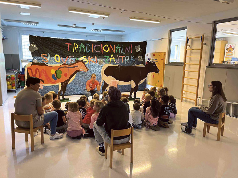 Eden izmed ciljev tradicionalnega slovenskega zajtrka je, da se v šolah in vrtcih govori o pomenu kmetijstva in čebelarstva. Zato smo v tednu, posvečenem slovenski hrani, izvedli štiri delavnice, na katerih smo otrokom približali delo kmeta, jim predstavili vrednost lokalne prehranske verige ter predstavili pomen tradicionalnega slovenskega zajtrka.